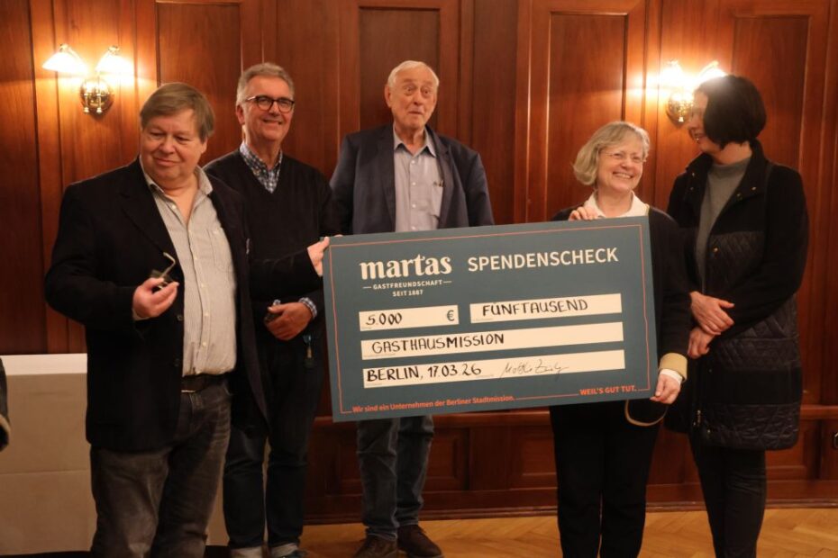 Das Team des martas-Hotels Albrechtshof hat den Vorstand der Berliner Gasthausmission auf der diesjährigen Mitgliederversammlung mit einer Spende von 5000 Euro überrascht. Das unterstreicht die besondere Verbindung zwischen Gasthausmission und der Adresse Albrechtstraße.