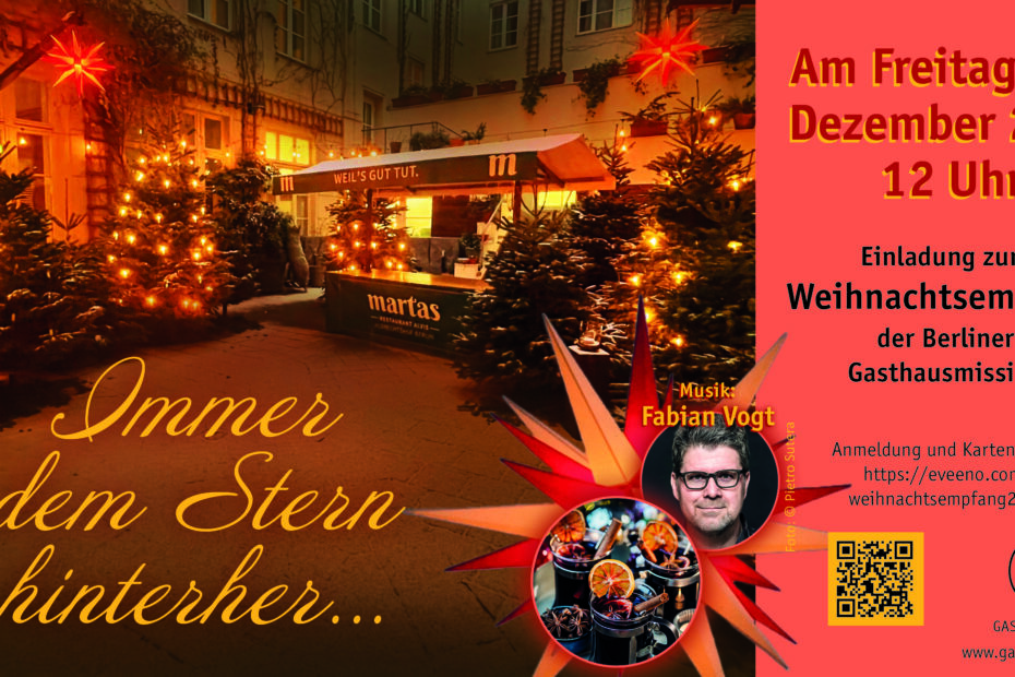 In diesem Sinne laden wir Sie und ihre Kolleg:innen herzlich zum Highlight im Dezember, dem Weihnachtsempfang der Berliner Gasthausmission, ein.