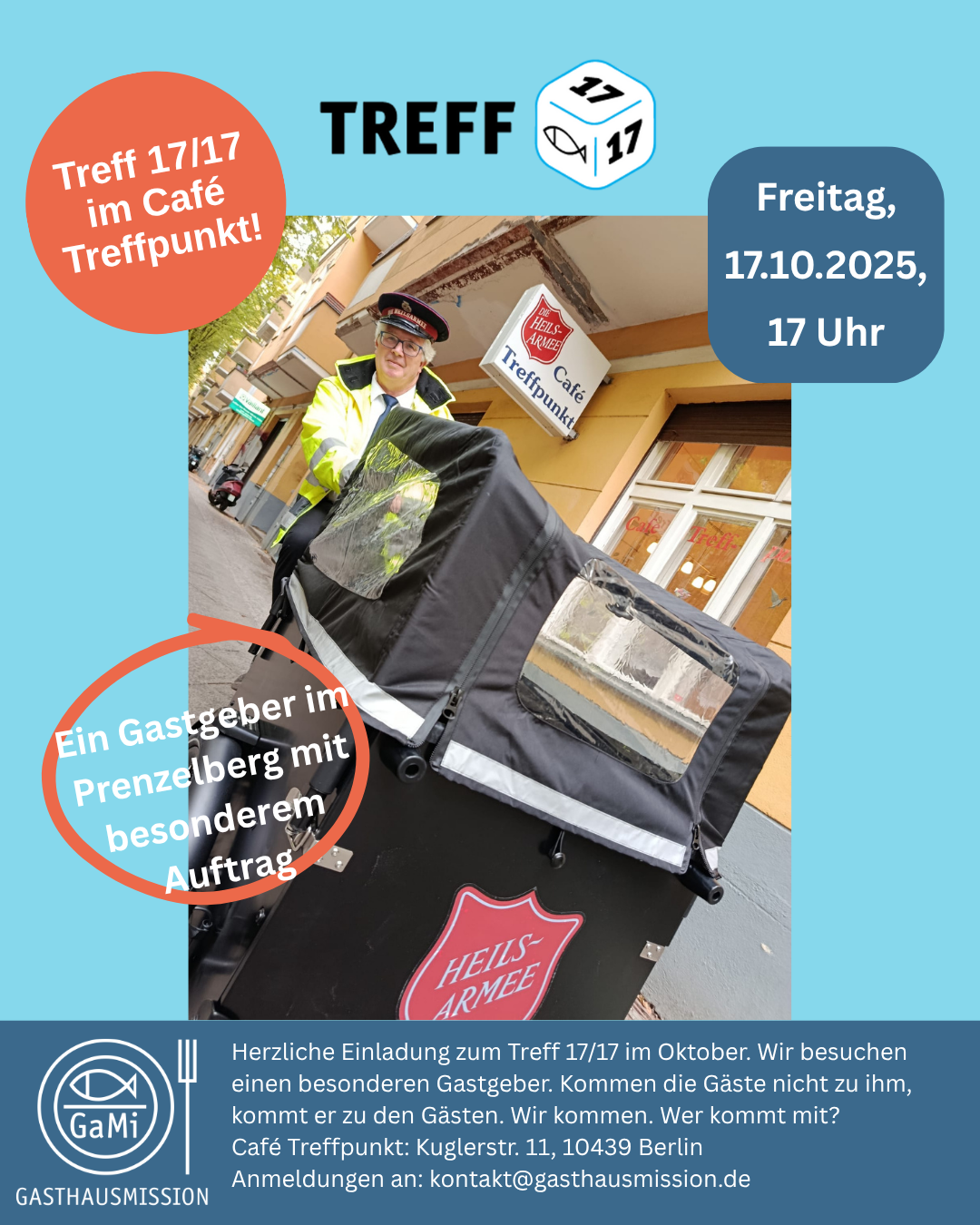 Der blaue VW-Bulli auf der gegenüberliegenden Straßenseite ist noch in Paderborn zugelassen. „Das bleibt auch so“, sagt sein Halter – obwohl der nun eine Berliner Adresse hat. „PB passt doch zu Prenzlauer Berg“, meint Michael Geymeier, während er die Eingangstür des „Treffpunkt“ in der Kuglerstraße aufschließt. Dahinter wartet der nächste fahrbare Untersatz mit dem roten Heilsarmee-Logo, diesmal ohne Zulassung. Das Lastenrad ist funkelnagelneu. Eine hohe Einzelspende habe die Anschaffung ermöglicht, erklärt der Chef, „mein Ziel ist es, damit raus in den Kiez zu fahren und Essen auszuteilen“. 60 Liter Suppe passten rein, hat er ausgerechnet.