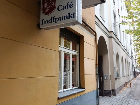 Der Treffpunkt für Menschen mit geringem Einkommen, die sonst alleine und vielleicht nur vor einer Stulle am Küchentisch säßen, ist das gleichnamige Café. Gegründet wurde es Anfang 1991. Voriges Jahr ging sein Betreiber in den Ruhestand. Michael Geymeier und Ehefrau Sabine, vom Dienstgrad Major und Majorin der Heilsarmee, haben das „Treffpunkt“ übernommen und sind nun dabei, ihm ein neues Profil zu geben. In der Ecke des Gastraumes steht ein Lesepult aus Acrylglas, das sonntags zum Gottesdienst unter das Holzkreuz an der Wand gerückt wird. Ein neues Stück Inventar, „bei Ebay gekauft“, sagt der Chef und zwinkert. Weil der Bezirk Pankow die Förderung der kirchlichen Einrichtung stark reduziert hat, sind Improvisation und Ideenreichtum beim Fundraising gefragt. Über das Gebet hinaus wird getrommelt – nächstes Etappenziel: Michael Geymeier möchte einen Berliner Gastronomen auftun, der ihm fünf bis sechs ausgemusterte Tische sponsert. 23 Sitzplätze hat das Café. In den frisch geweißelten Räumen gibt es ein Wochenprogramm mit Gottesdienst, Bibelgespräch und – neu seit Oktober: einem Filmnachmittag.